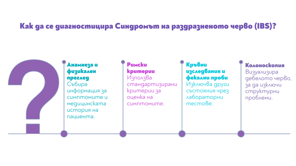 Диагностичният процес обикновено започва с подробна анамнеза и физикален преглед. Лекарят ще използва т.нар. “Римски критерии”, които изискват наличието на повтаряща се коремна болка (поне веднъж седмично през последните 3 месеца), свързана с два или повече от следните фактори: свързана с дефекация, промяна в честотата на изхождане или промяна във формата на изпражненията. За да се изключат други състояния като целиакия, възпалителни чревни заболявания (болест на Крон, улцерозен колит) или инфекции, могат да бъдат назначени кръвни изследвания, фекални проби, а понякога и колоноскопия.