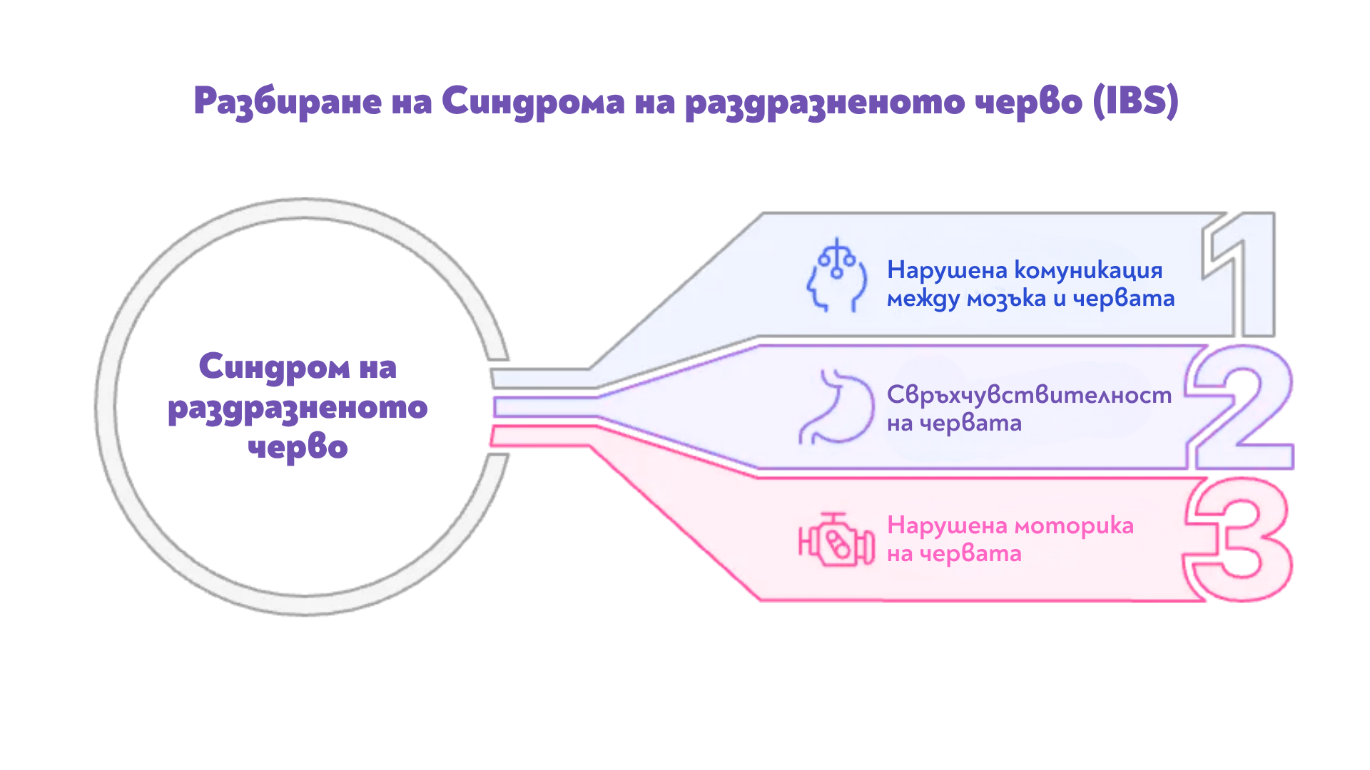 Синдромът на раздразненото черво е хронично функционално разстройство на стомашно-чревния тракт. Това означава, че червата изглеждат напълно нормални при изследване (няма възпаление или структурни увреждания), но не функционират правилно. Проблемът се крие в нарушената комуникация между мозъка и червата, известна като ос “мозък-черва”.