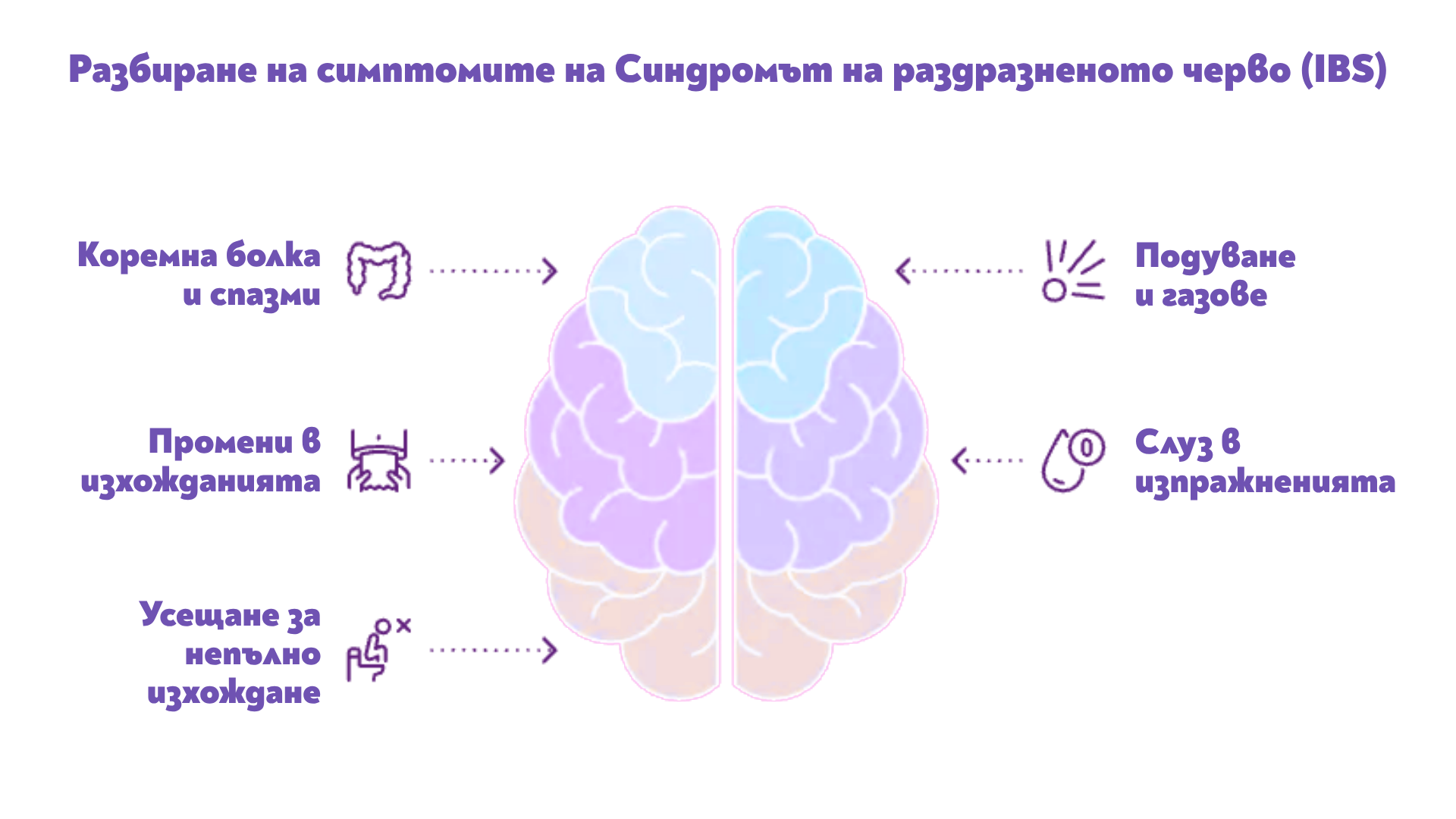 - Промени в изхожданията: Това е ключов симптом, който помага за класифицирането на различните видове СРЧ. Може да включва диария (IBS-D), запек (IBS-C) или редуване на двете състояния (IBS-M);