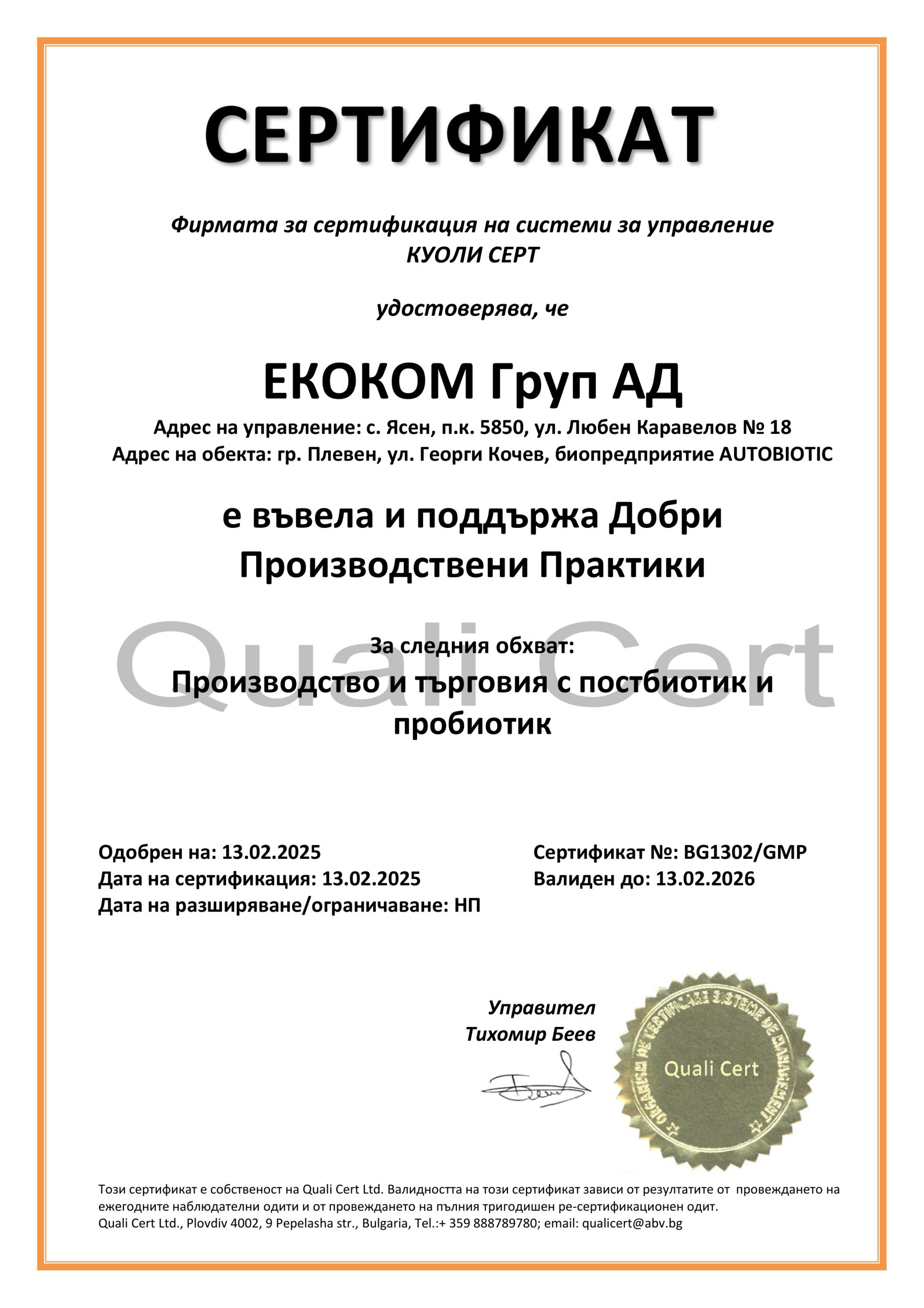 Το μεταβιοτικό Bibiotic παράγεται στη βιοεπιχείρηση Autobiotic στην πόλη του Πλέβεν. Ιδρύθηκε το 2012 με στόχο την παραγωγή μιας νέας γενιάς προβιοτικών προϊόντων, πολύ πιο χρήσιμων και αποτελεσματικών. Η επιχείρηση διαθέτει τον πιο σύγχρονο και υψηλής τεχνολογίας εξοπλισμό, που πληροί όλα τα παγκόσμια βιοτεχνολογικά πρότυπα και απαιτήσεις για την απομόνωση, ταυτοποίηση και καλλιέργεια όλων των προβιοτικών βακτηριακών ειδών. Ένα επιτελείο μικροβιολόγων και βιοτεχνολόγων υψηλής ειδίκευσης φροντίζει για την παρασκευή ενός ποιοτικού και ασφαλούς προϊόντος. Ιδιαίτερη προσοχή δίνεται στην αναπτυξιακή δραστηριότητα, με στόχο τη βελτίωση των τεχνολογιών αλλά και την βελτίωση της ποιότητας και της αποτελεσματικότητας των προϊόντων.