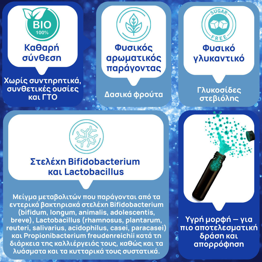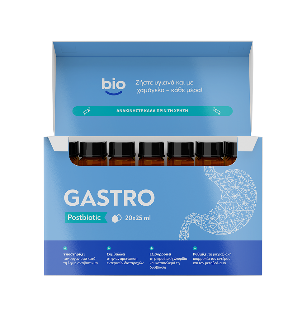 Το μεταβιοτικό BIBIOTIC® GASTRO αποτελεί έναν ισχυρό ρυθμιστή της μικροβιακής χλωρίδας και έχει αποδεδειγμένη αποτελεσματικότητα στην αντιμετώπιση της δυσβίωσης. Η εντερική δυσβίωση είναι ένα από τα σημαντικότερα προβλήματα υγείας στη σύγχρονη εποχή. Το πεπτικό μας σύστημα φιλοξενεί τρισεκατομμύρια μικροοργανισμών διαφόρων ειδών, καθένα από τα οποία εκτελεί συγκεκριμένες λειτουργίες και αποτελεί μέρος ενός πολύπλοκου μεταβολικού δικτύου. Ακόμη και οι παθογόνοι μικροοργανισμοί έχουν τον ρόλο τους, όπως η εκπαίδευση και η διατήρηση της ενεργής λειτουργίας του ανοσοποιητικού συστήματος. Επομένως δεν υπάρχουν «καλά» ή «κακά» βακτήρια - καθοριστικός παράγοντας είναι η ισορροπία μεταξύ τους. Η φυσιολογική και υγιής κατάσταση της μικροβιακής κοινότητας ονομάζεται νορμοβίωση ή ευβίωση. Όταν αυτή η ισορροπία διαταραχθεί και κάποιοι μικροοργανισμοί υπερτερούν έναντι άλλων, δημιουργείται μικροβιακή ανισορροπία, γνωστή ως δυσβίωση. Αυτό επιφέρει αλλαγές στην ποσότητα και στην ποιότητα των βακτηριακών μεταβολιτών, προκαλώντας διάφορα προβλήματα υγείας, όπως φούσκωμα, αέρια, κράμπες, διάρροια, δυσκοιλιότητα, κοιλιακούς πόνους, κόπωση, αλλεργικές αντιδράσεις, διαταραχές του ανοσοποιητικού συστήματος και άλλα. Οι αιτίες της δυσβίωσης είναι ποικίλες και περιλαμβάνουν την έκθεση σε τοξίνες από το περιβάλλον, καταστάσεις στρες, κακή διατροφή, χρήση αντιβιοτικών και άλλων φαρμάκων, ανοσοανεπάρκεια, παρασιτικές λοιμώξεις, κατανάλωση τροφίμων με φυτοφάρμακα, συντηρητικά και άλλα αντιβακτηριακά συστατικά. Για να αποκαταστήσουμε την ισορροπία της εντερικής μικροβιακής κοινότητας, πρέπει να αποκαταστήσουμε και την ισορροπία των βακτηριακών μεταβολιτών. Αυτοί με τη σειρά τους αναστέλλουν την ανάπτυξη των ανεπιθύμητων μικροοργανισμών και ενισχύουν την ανάπτυξη των μειωμένων ωφέλιμων ειδών. Η λήψη του μεταβιοτικού BIBIOTIC® GASTRO παρέχει τους απαραίτητους βακτηριακούς μεταβολίτες που υποστηρίζουν την αποκατάσταση της φυσιολογικής μικροβιακής ισορροπίας και την αντιμετώπιση της δυσβιωτικής κατάστασης.