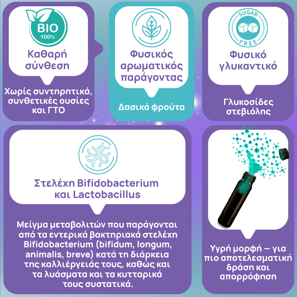 Το μεταβιοτικό Bibiotic® για παιδιά και ενήλικες έχει ισχυρή αντιϊική δράση. Είναι εξαιρετικά αποτελεσματικό κατά όλων των τύπων ιών της γρίπης, κορωνοϊών και άλλων ιογενών λοιμώξεων, και μπορεί να χρησιμοποιηθεί ως κύριο θεραπευτικό μέσο. Είναι γνωστό ότι οι ιογενείς λοιμώξεις δεν θεραπεύονται με φάρμακα. Το ανοσοποιητικό σύστημα τις αντιμετωπίζει. Και αν πάρει βοήθεια από έξω, θα μπορέσει να καταπολεμήσει την ασθένεια πιο εύκολα. Ως ανοσορυθμιστής, το μεταβιοτικό Bibiotic® για παιδιά και ενήλικες ενεργοποιεί και ρυθμίζει το ανοσοποιητικό σύστημα έτσι ώστε να μπορεί να αντιμετωπίσει γρήγορα και αποτελεσματικά τις ιογενείς λοιμώξεις. Επιπλέον, παρέχει στον οργανισμό πολύτιμες βιολογικές ουσίες, όπως ένζυμα, βιταμίνες, οργανικά οξέα κ.λπ., που περιορίζουν την εμφάνιση διαταραχών που προκαλούνται από τη λοίμωξη, όπως ναυτία, έμετο, διάρροια, κοιλιακούς σπασμούς, πόνους και δυσφορία. Επίσης το μεταβιοτικό Bibiotic® για παιδιά και ενήλικες παρέχει στον οργανισμό και αντιβακτηριακούς μεταβολίτες, οι οποίοι μειώνουν την πιθανότητα η ιογενής λοίμωξη να εξελιχθεί σε βακτηριακή. Επιπλέον, το Bibiotic® για παιδιά και ενήλικες βελτιώνει τον εντερικό φραγμό, περιορίζοντας έτσι τη δυνατότητα διείσδυση τοξινών στον οργανισμό και την εμφάνιση πρόσθετων επιπλοκών.